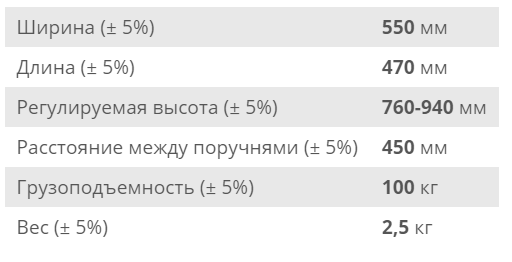 Опорные поручни ходунков выполнены из анодированного алюминия и не подвергается коррозии, скрепляющая рама – из стали с полимерным покрытием. Ходунки легко складываются и не занимают много места, имеют 8 положений регулировки высоты с шагом в 2,5 см. Мягкие накладки на поручнях ходунков не дают рукам скользить; резиновые наконечники, расположенные на опорах ходунков, предохраняют от скольжения по твердым поверхностям.
